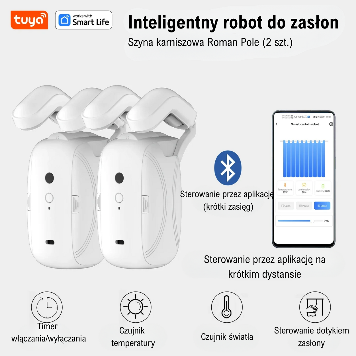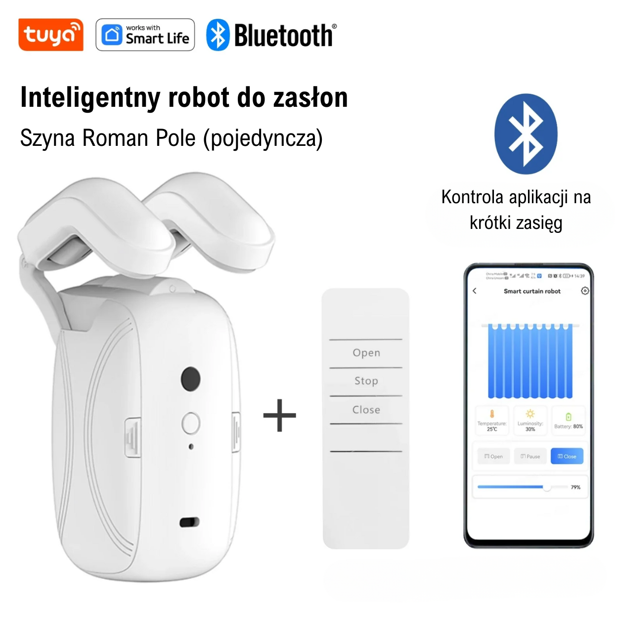 Bluetooth Tuya Smart Curtain Robot, karnisz drążkowy (Roman Rod Track), sterowanie przez aplikację, automatyczne otwieranie, uruchamianie pociągnięciem ręcznym, zamykanie reagujące na światło/temperaturę, wbudowana bateria litowa 4000 mAh, do 6 miesięcy użytkowania, udźwig 17,64 lb, maksymalny przesuw 20 m, łatwy montaż, wymiary 0,59 × 1,73 cala, możliwość konfiguracji pojedynczej lub podwójnej jednostki (zdalne sterowanie wymaga bramki Tuya).